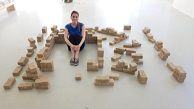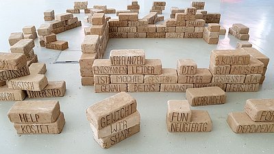 I versuche to describe the experience of moving to an unknown Ort and having to build simple und safe Fundament. Wörter like bricks need many zu have Zweck and Struktur. When lernen a Sprache, one muss start mit a foundation to be built upon; führend to an Verständnis of wie to construct the Sprache. I benutze primitive Techniken to build Ziegel, imprinting my Muttersprache on one site and Deutsch on the other side to show a Verständnis of this language. The Zeit to make these bricks reflect die time spent to learn the basics of German.