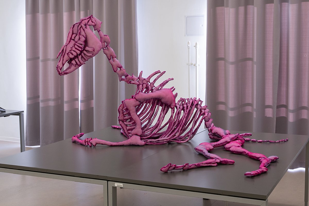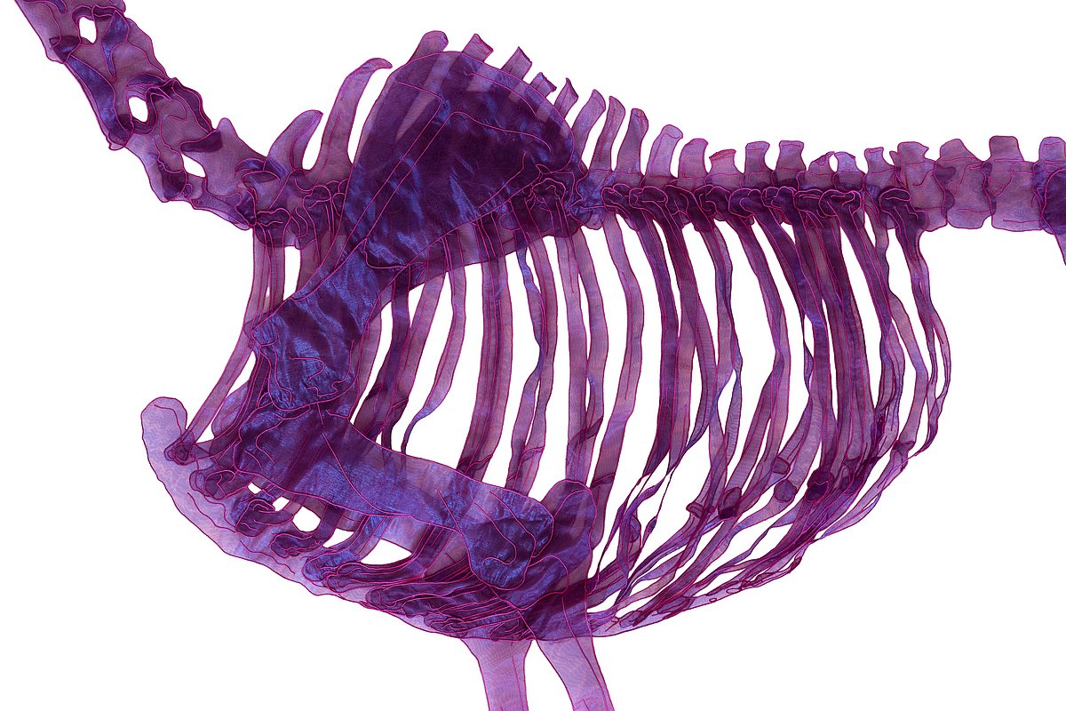 Ein plastisches Pferdeskelett als textiles Objekt, ausgeführt als weiche Skulptur. Die Form besteht aus empfindlichem Two-Tone-Organza, dessen changierende Farbigkeit die fragile Struktur betont. Das zweidimensionale Pferdeskelett besteht aus einem Two-Tone-Organza, dessen Oberfläche mit Polyamidgarn bestickt wurde. Die Stickerei folgt den Linien des skelettalen Aufbaus und setzt gezielte Verdichtungen, die innere Strukturen sichtbar machen sollen.