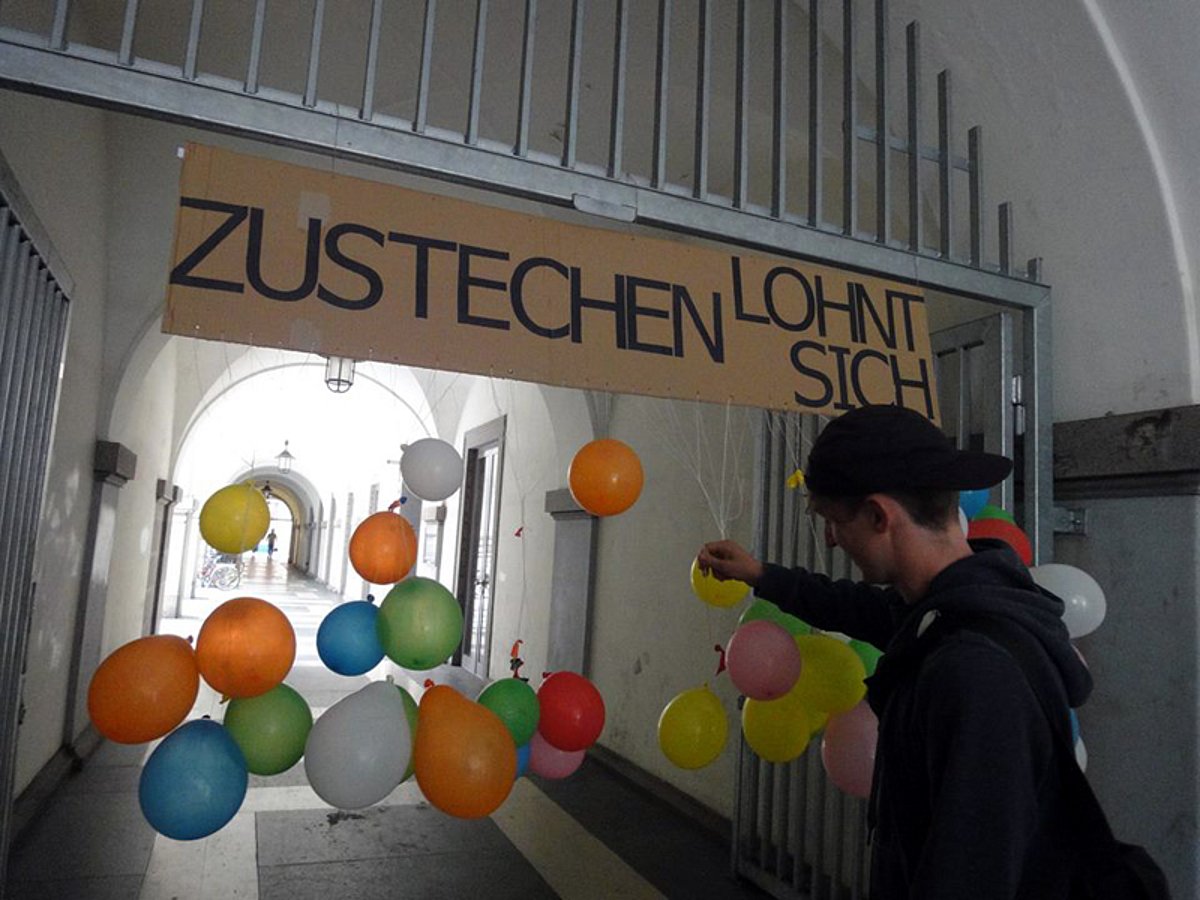 So entstand der Duftballonvorhang: Auf dem oberen Eingangsgitter an den Arkaden montierten wir etliche Schnüre, an denen Luftballons auf Schulter,- bis Bauchhöhe hingen. In diesen Luftballons haben wir verschiedene Parfums gesprüht. Zwischen den Ballonschnüren haben sich auch einige Schaschlik-Spießchen befunden, mit denen die Duftballons zerstochen werden sollten. Damit die Passanten dieser Aufforderung auch nachkommen konnten, haben wir über dem Vorhang ein Schild befestigt mit der Aufschrift: ZUSTECHEN LOHNT SICH So entstand aus dem unangenehm riechenden Gang kurzzeitig eine etwas andere Art von Geruchserlebnis. Für fast jedermann war ein Duft dabei, doch wusste man nie welcher Duft in welchem Ballon zu „erstechen“ war.