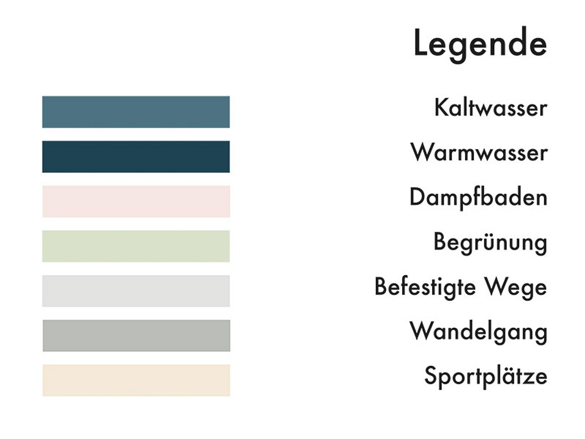 Das schneidende Wasserbecken dient im Innenbereich zur Abkühlung nach dem Badegang und als Schwimmbecken, im Außenbereich zur Abkühlung nach dem Sport, sowie als Ort der Zusammenkunft.