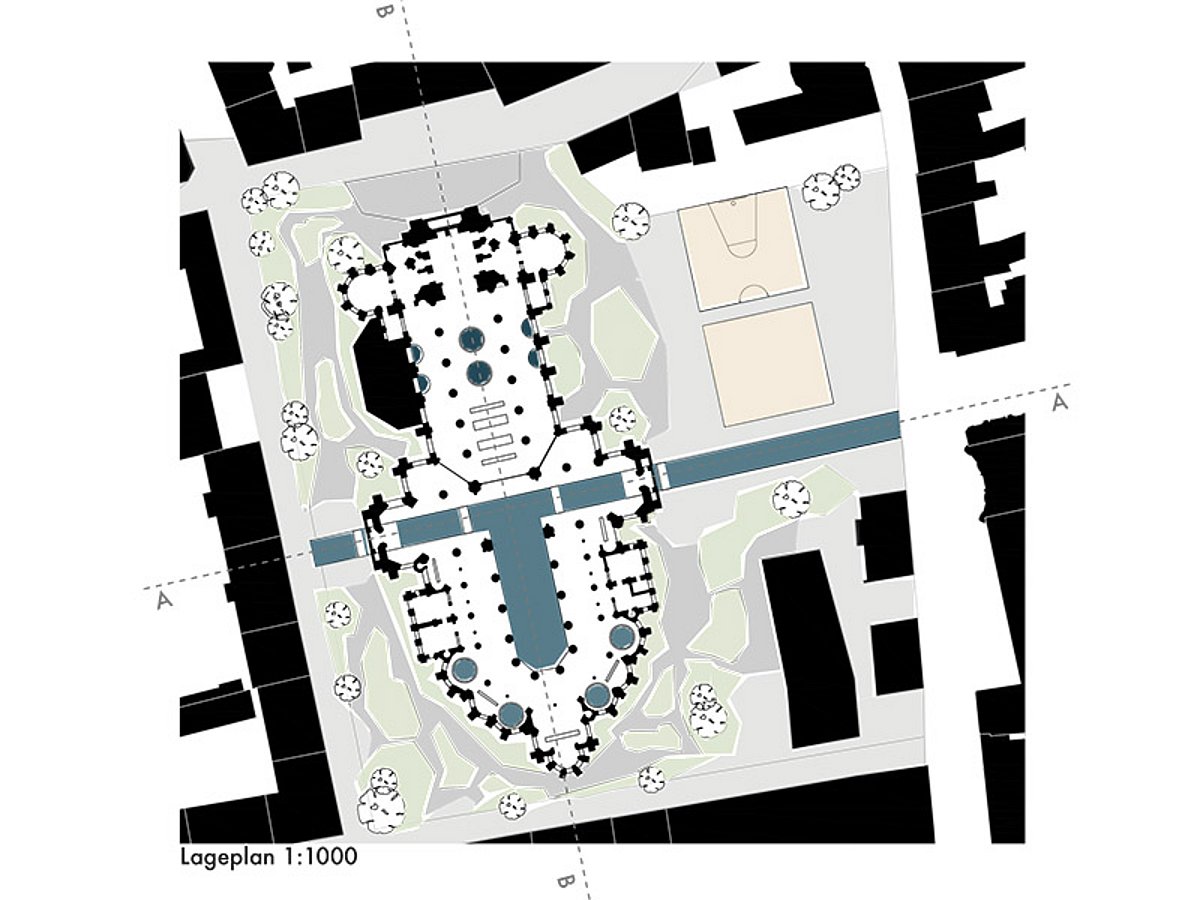 „Der Jungbrunnen“ entspringt dem Vorbild eines Römischen Bades. Der rituelle Badegang wurde übernommen und in den Grundriss des vorhandenen Maria-Empfängis-Domes eingebaut. Das Baden war im antiken Rom ein wichtiger Bestandteil des Alltags und folgte einer strikten Reihenfolge. Der Vorgang des Reinigen teilt sich auf in Heissbaden, Dampfbaden und Kaltbaden, was sich alles in dem Gebäude befindet, wobei das Kaltwasserbecken den Dom und den Vorplatz durchschneidet.
