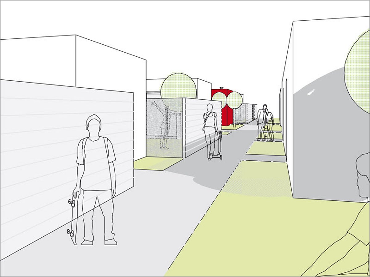 Die Module bilden in der Anordnung Hofhäuser mit einem oder zwei Geschoßen. Erschlossen werden die Einheiten entweder über den Hof oder die Rückseite. Alle Einheiten sind barrierefrei erreichbar. - Vertikale Höhensprünge sind durch die Vorgaben der behindertengerechten Erschließung sowie der Verknüpfbarkeit der Module untereinander auf maximal 50 cm zwischen zwei benachbarten Modulen beschränkt. Sämtliche Wege und Aufenthaltsbereiche sind vom Autoverkehr strikt getrennt. Autos können entweder auf Stellplätzen entlang der Erschließungsstraße oder in Garagen unter den Wohnungen mit zum Teil direkten Zugängen abgestellt werden.