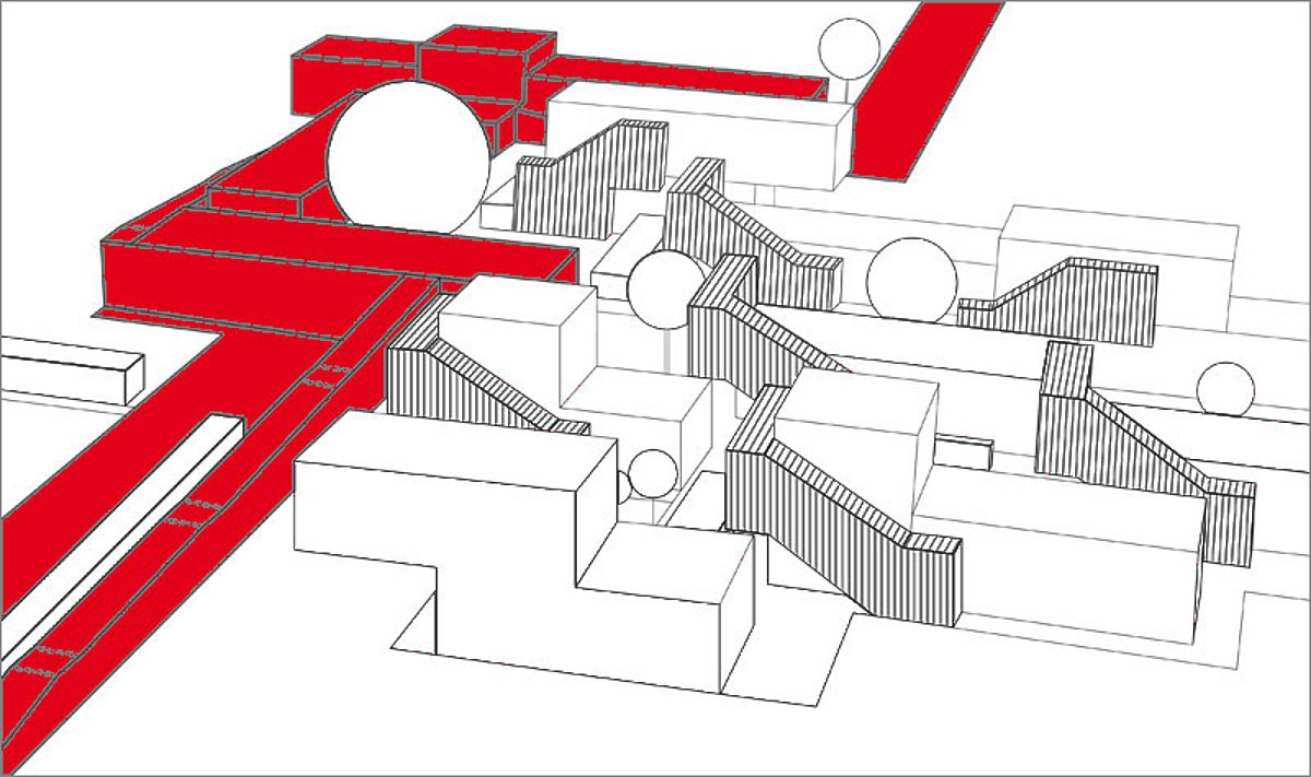 Die vorhandene Feldstruktur wie auch die typische historische Bebauung der Streckhöfe sind Anleitung für die Grundstruktur und Anordnung der Wohneinheiten. Durch horizontales Verschieben von einzelnen, langgezogenen Baukörpern ergibt sich eine Bebauung mit differenzierten Außenräumen von privat über halbprivat und gemeinschaftlich bis öffentlich. Ein gefaltetes „Band“, das sich durch die gesamte Struktur zieht, unterteilt diese zum einen, bildet aber gleichzeitig auch ein verbindendes Element und übernimmt alle gemeinschaftlichen Funktionen. Somit wird sowohl das Bedürfnis nach Privatheit und Intimität, als auch der Wunsch nach Kommunikation und gemeinschaftlichen Aktivitäten befriedigt.