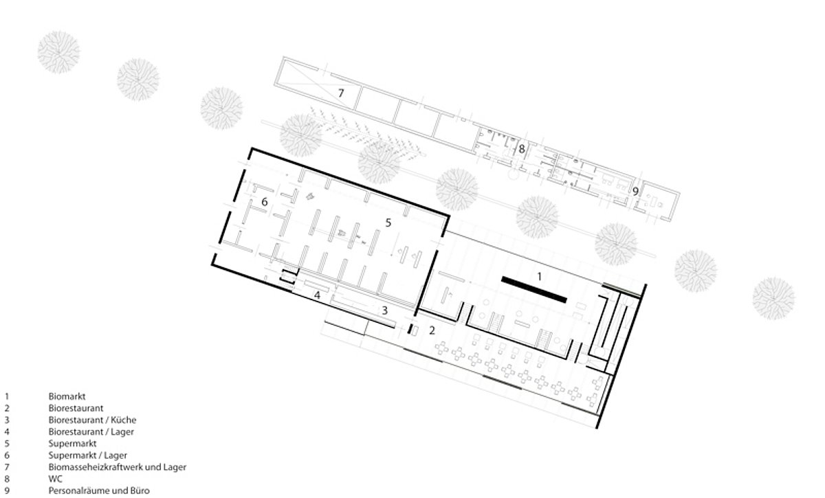 „Das Auge isst mit“, diesem Motto folgend wird bei diesem Projekt auch dem Kauferlebnis Aufmerksamkeit gezollt. Im Zusammenspiel mehrerer Baukörpern entsteht im Innen- wie im Außenbereich ein anspruchsvolles Raum- und Funktionsprogramm. Die leichte, lichte Markthalle mit Verteilerfunktion, ein um ein Halb-geschoss versenkter Lehmkeller, darüber liegend die Restauration mit freiem, leicht erhöhten Blick auf die Felder. Jeder dieser Bereiche lädt mit seinen sinnvollen und sinnlichen Qualitäten die KundInnen zum Kosten und Verweilen ein.
