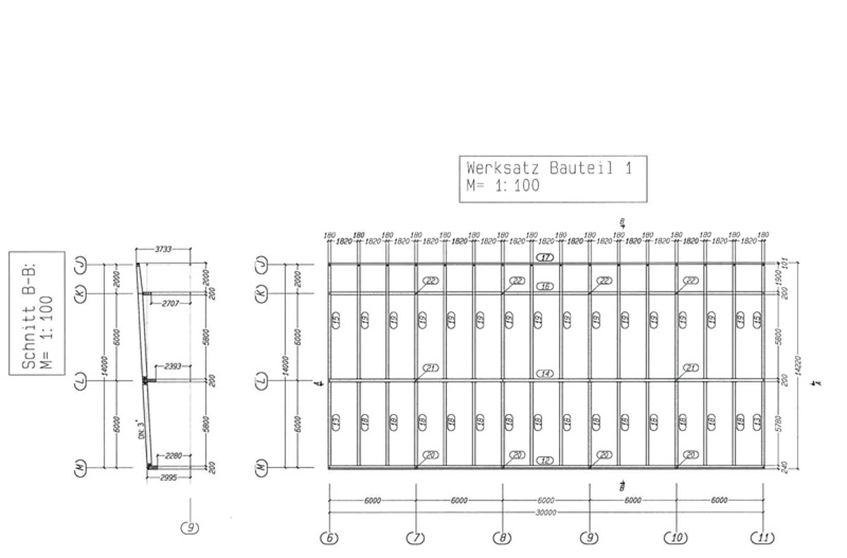 Die Aussteifung der Wände erfolgt vor allem über das geschlossene Volumen des Supermarktes. Und auch die schubsteifen Dachelemente decken nur den Supermarkt und das Restaurant. Dadurch wird die Markthalle frei gespielt, kann große Glasfassaden und eine transluzente Dachhaut erhalten.