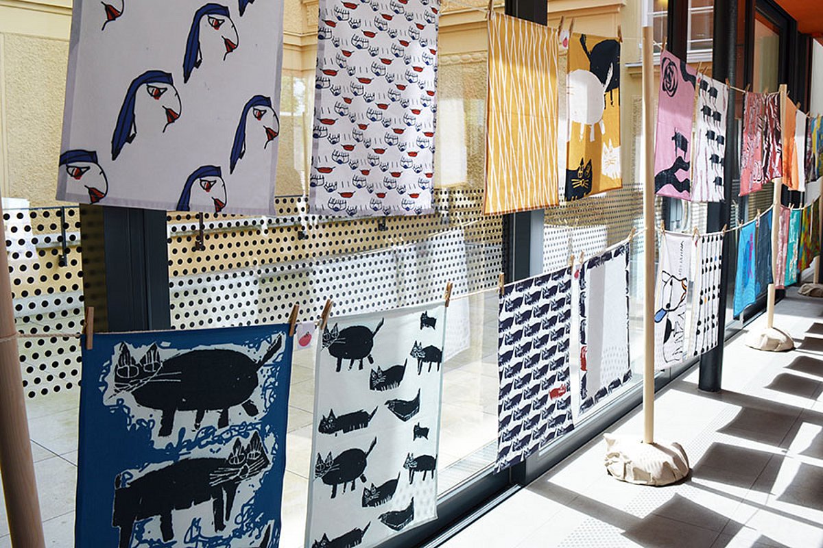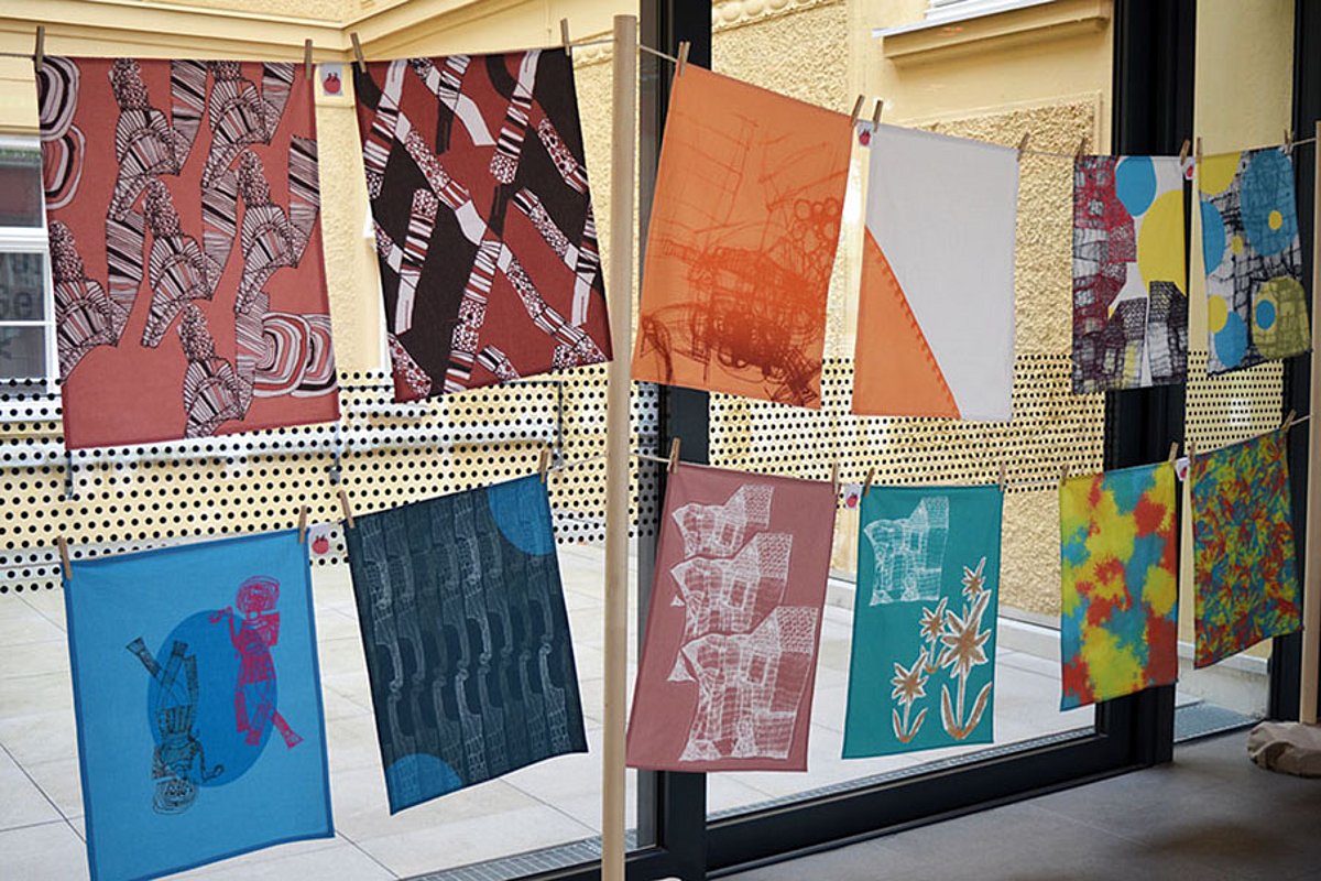 Studierende der Studienrichtungen textil·kunst·design, Gestaltung: Technik.Textil und Bildnerische Erziehung zeigten ihre Textilentwürfe, die in Zusammenarbeit mit Künstlerinnen und Künstlern der Kunstwerkstatt des Diakoniewerks entstanden.