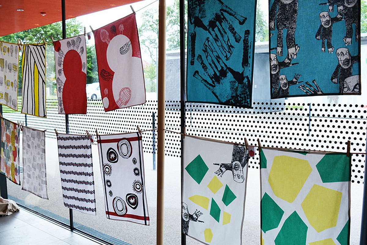 Begleitet von Lehrgangsleiterin Mag.art Teija Hohl besuchten die Studentinnen und Studenten die Künstler der Kunstwerkstatt des Diakoniewerks über einen längeren Projektzeitraum, um mit ihnen ins Gespräch zu kommen, über ihre Maltechniken und auch ihre Beweggründe für ihre künstlerische Tätigkeit zu erfahren. Gemeinsam wurden Werke der Künstler besprochen und entschieden, welche von den Studierenden bearbeitet und einer weiteren Gestaltung unterzogen werden durften. Auf 50 x 70 cm großen Baumwolltüchern wurden im digitalen Textildruck die neu entstandenen Motive vervielfältigt und weiters von den Studierenden zu Geschirrtüchern genäht.