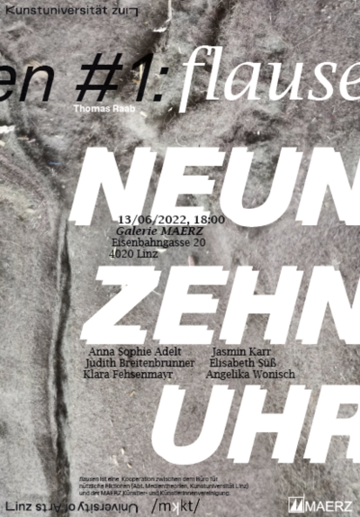 Am Mo., 13.06.2022, 18.00 Uhr, laden MKKT-Studierende zur Lecture Performance »Neunzehn Uhr« in die Galerie MAERZ ein. Sie lesen und führen Texte auf, die sie dieses Sommersemester im MKKT-Seminar des Schriftstellers, Essayisten, Geologen und Übersetzers Thomas Raab geschrieben haben. Raabs Seminar »Beschreibung als Methode« ist der Auftakt zur Serie »flausen« der Abteilung Medientheorien. Nichts als Flausen im Kopf? Ein Einfall kündigt sich häufig als Tagtraum, heiße Luft, Grille an. Wir suchen den losen Faden eines Wollknäuels, jagen Chimären und Wollmäusen hinterher. »flausen« ist der Titel einer neuen Kooperation zwischen dem Büro für nützliche Fiktionen der Kunstuniversität Linz und der MAERZ Künstler- und Künstlerinnenvereinigung.