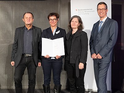 v.l.: Mario Kostal (Vizerektor für Lehre, Universität Mozarteum), Romana Hagyo (Preisträgerin), Anne von der Heiden (Leiterin Abteilung Kunstgeschichte und Kunsttheorie, Kunstuniversität Linz) und Elmar Pichl (Sektionschef, BMBWF) © BMBWF/Martin Lusser