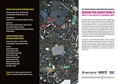 Im ersten "Art Meets Radical Openness Forschungslabor" arbeiten Andreas Zingerle und Linda Kronman (kairus.org) im Rahmen einer servus.at Artist in Residence 2015an ihren aktuellen künstlerischen Forschungsfragen. Die beiden Künstler_innen haben 2014 die weltgrößte Elektroschrotthalle „Agbogbloshie“ in Ghana besucht und 22 Laptop- und Computerfestplatten gekauft. Diese 22 Festplatten sind Ausgangspunkt und Rohmaterial für die künstlerische Forschung im Rahmen dieser Residency.
