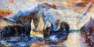 Isabella Scharf-Minichmair: nach dem Sturm in ruhige Gewässer gleiten, 2023, Acryl auf Holz, 50 x 100 cm