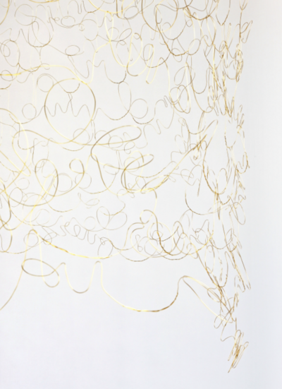 Wie ein organisch gewachsenes Gewebe erscheint die subtil anmutende Installation An die ewige Schönheit. Dafür wurden mystische Texte von Teresa von Avila und von Edith Stein aus feinem Messingdraht geschrieben und miteinander verwebt. Das goldene Netz, das in Form von zwei ineinanderliegenden Zylindern im Raum schwebt, lässt so das Geschriebene verdichten. An die ewige Schönheit ist der Versuch, sich dem Unbegreiflichen auf sinnlich-visuelle Weise zu nähern.