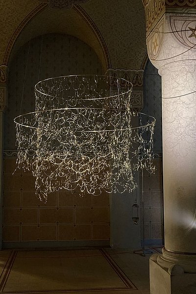 Wie ein organisch gewachsenes Gewebe erscheint die subtil anmutende Installation An die ewige Schönheit. Dafür wurden mystische Texte von Teresa von Avila und von Edith Stein aus feinem Messingdraht geschrieben und miteinander verwebt. Das goldene Netz, das in Form von zwei ineinanderliegenden Zylindern im Raum schwebt, lässt so das Geschriebene verdichten. An die ewige Schönheit ist der Versuch, sich dem Unbegreiflichen auf sinnlich-visuelle Weise zu nähern.