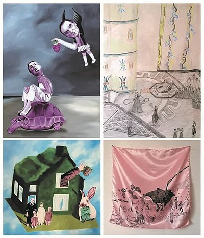 Julia F. Zöhrer zeigt in ihren Arbeiten Zeichnungen auf Stoffen. Diese zugeschnittenen Textilien erzeugen durch die Hängung beinahe einen objekthaften Zugang zu den Arbeiten. Die bildhafte Sprache auf den Werken ist mystisch, grotesk und wirkt symbolisch aufgeladen. Ihre Motive zeigen Mischwesen aus Mensch und Tier, reduziert gezeichnete Pflanzen und Gruppen von Personen, die scheinbar rituelle Zeremonien durchführen.