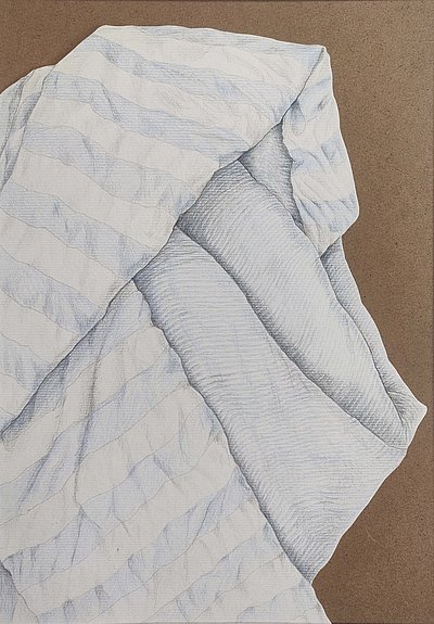 Auch bei Winkelbauers neuesten Buntstiftarbeiten auf Papier mit dem Titel “private structures” handelt es sich um Fundstücke - im weitesten Sinn. Es sind Ausschnitte von Decken, Polstern und Bettwäsche, die zart und genau gezeichnet einen Einblick in persönlichste Räume geben. Privates, dessen Geschichten unerzählt bleiben. Textilien, in deren Falten und Mustern viele Jahre persönlicher Erinnerungen stecken.