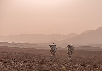 Vor einem orangefarbenen Nachthimmel fällt fahles Licht aus den Kuppeln einer luftgefüllten Behausung. Eine Raumfahrerin verharrt im roten Sand zwischen anonymen Containerreihen.