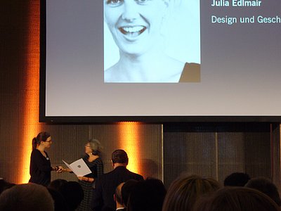 Julia Edlmair erhielt für ihre Masterarbeit "Design und Geschmack" (Studienabschluss Industrial Design, Jänner 2012) vom Bundesministerium für Wissenschaft und Forschung den Würdigungspreis 2012 verliehen.
