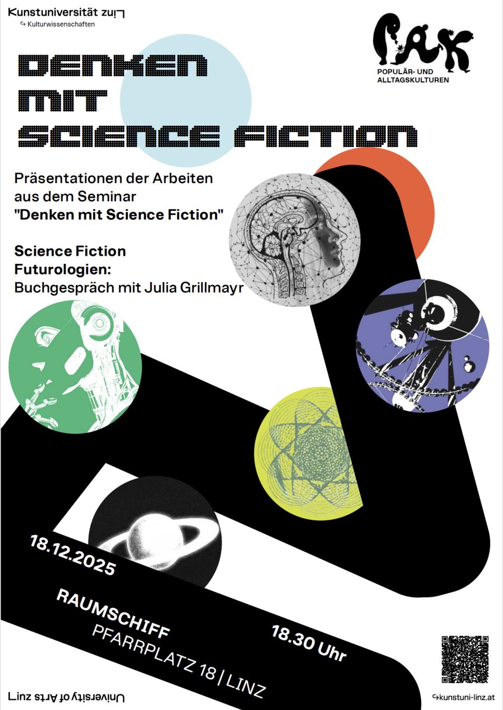 Presentations of the works from the seminar Thinking with Science Fictionat the Department of Cultural Studies & discussion on the recently published book Science Fiction Futurologiesby Julia Grillmayr.