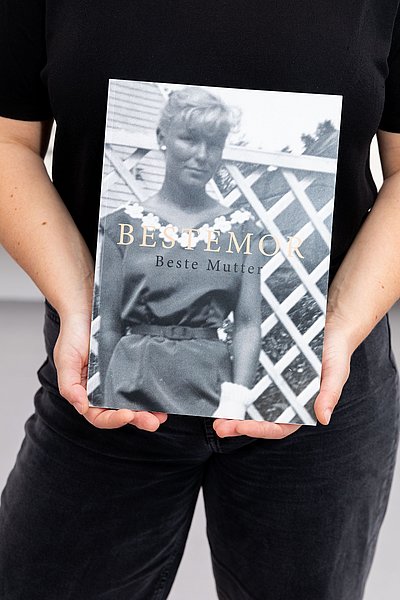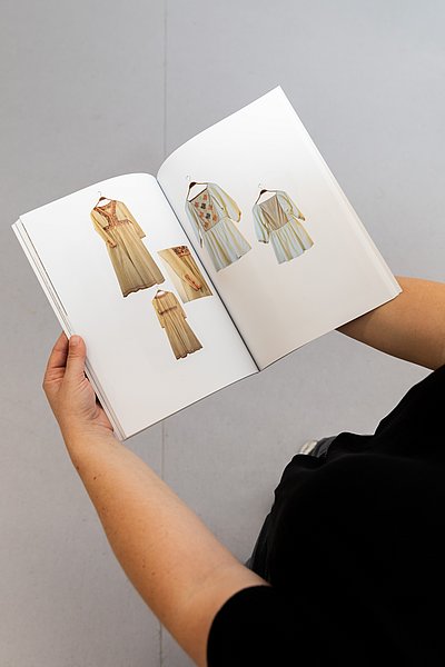 Die Künstlerin über ihre Arbeit "BESTEMOR": Beste Mutter ist ein Bildband über die Kleidung meiner Großmutter. Die Stücke wurden, vor allem meiner Schwester und mir, über die Jahre „vermacht“. Manche Kleidungstücke trugen wir in unserem Alltag, andere bewahrten wir auf, manche restaurierten wir. Zum Teil ist meine Großmutter Erzeugerin, teilweise sind sie erworben und einige Geschenke. Zusätzlich zu den eher neutralen Abbildungen der Kleidung, gibt es auch Platz für Fotos meiner Großmutter in der jeweiligen Kleidung sowie Bilder von uns in den Erbstücken. Es ist eine Arbeit, die zum Durchblättern gedacht ist. Sie soll so aufliegen, dass es keine Hürde für die/den BesucherIn darstellt, hinzugehen und sich für eine längere Zeit damit zu beschäftigen.
