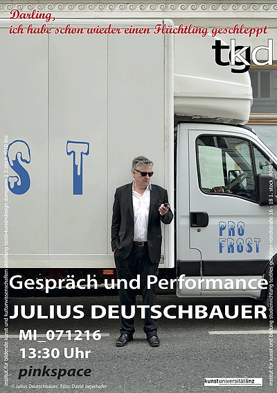 Ausgehend von dem Plakat "Darling, ich habe schon wieder einen Flüchtling geschleppt" für den Antirassismusvergnügungspark (Sommerszene Salzburg 2016) hantelt sich Julius Deutschbauer von Plakat zu Plakat zurück bis in die Anfänge seiner Plakatkunst im Jahre 1993. „Die Erinnerung ist eine Wäscheleine“, schreibt Beckett in seinem Buch Proust. Dazu gibt es Plakate zur freien Entnahme. Gummiringerl liegen bereit.