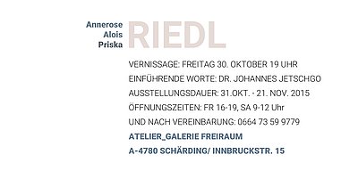 Eröffnung: 30.Okt.2015, 19.00 Uhr; Ausstellung bis: 21.Nov.2015 Atelier Galerie Freiraum, Innbruckstrasse 15, 4780 Schärding