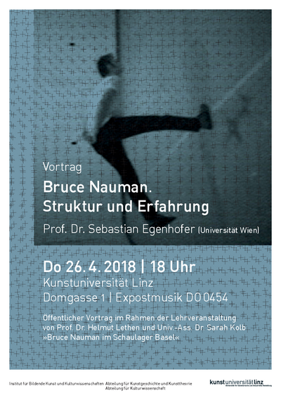Öffentlicher Vortrag der Abteilungen für Kunstgeschichte und Kunsttheorie und für Kulturwissenschaft im Rahmen der Lehrveranstaltung von Prof. Dr. Helmut Lethen und Univ.-Ass. Dr. Sarah Kolb »Bruce Nauman im Schaulager Basel«.