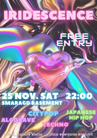 Iridescence is a party and performance where different rhythms and styles take place. That night we will have techno music, japanese hip hop, citypop and an Algorave. We invite you to dance and explore different musical proposals.