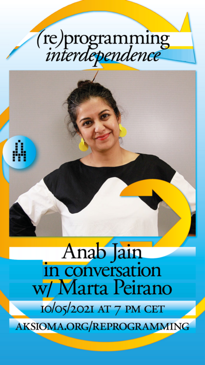 The next event is (re)programming: Interdependence Post-Human Politics, with Anab Jain, which will be streamed on Monday, 10th May 2021 at 7 PM CET.
