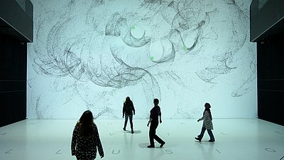 Die Intention der „Kooperative Ästhetik besteht darin, den Deep Space in einen Raum zu verwandeln, in dem die Besucher*innen durch Herumgehen den visuellen Output der Wand-und Bodenprojektionen und den Sound beeinflussen.