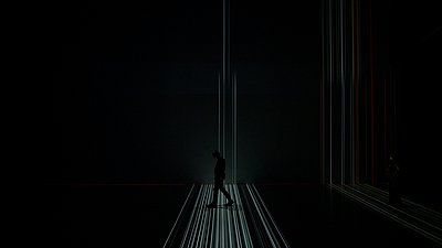 „Sound Mixer“ by Monica Vlad is an audiovisual work in which participants turn into knobs on a mixing board, To begin, all participants line up against the right black wall of Deep Space. One person should then start walking from the right side of Deep Space 8K to the left side. Lines can be seen and even heard on the wall and floor. When the other people follow, a sound installation is gradually built up and the lines on the wall and floor can be seen in different colors.