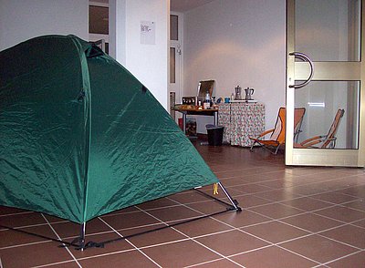 Samt Zelt, Schlafsack und Campingstühlen wollen wir drei Tage unser Institut zum Camping Club umfunktionieren. Wenn sich bei "Camp" angeblich "eine Nähe zur Historisierung vergangener Populärkultur, zur Retro-Welle und zu abgesunkenen soziokulturellen Mentalitäten auftut", liegt doch nichts näher, als dass wir biederen