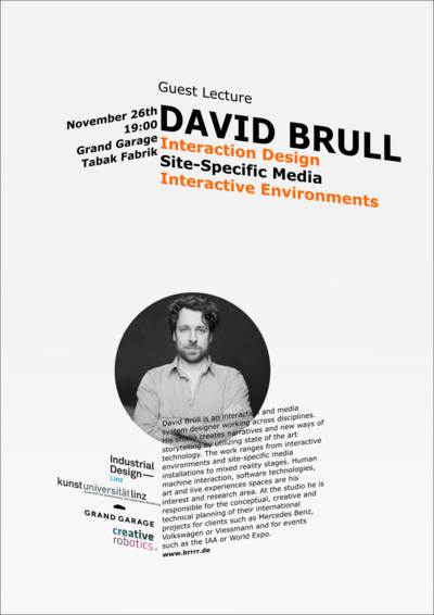 The Institute of Space and Design at UfG Linz has invited David Brüll for a guest lecture. David is an interaction and media system designer working across disciplines. His studio creates narratives and new ways of storytelling by utilizing state of the art technology. The work ranges from interactive environments and site-specific media installations to mixed reality stages. Human machine interaction, software technologies, art and live experiences spaces are his interest and research area. At the studio he is responsible for the conceptual, creative and technical planning of their international projects for clients such as Mercedes Benz, Volkswagen or Viessmann and for events such as the IAA or World Expo.