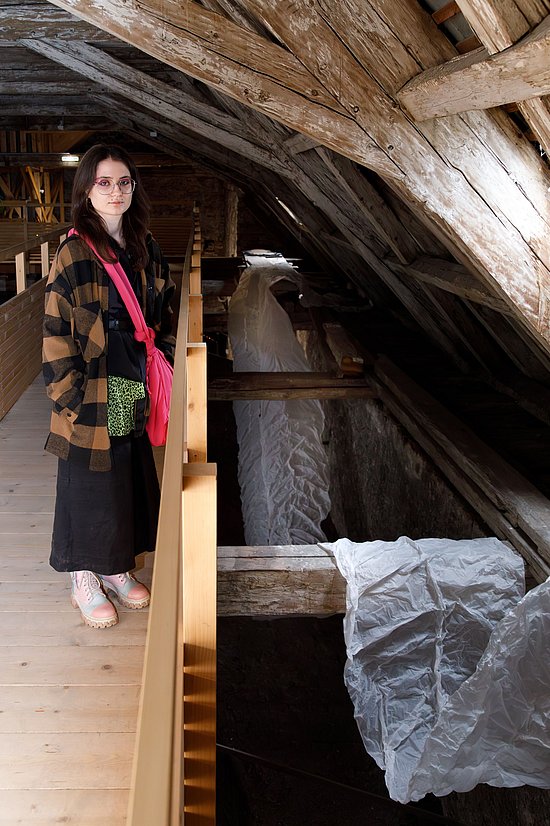 Zelal Engin, Studierende "Plastische Konzeptionen / Keramik" an der Kunstuni Linz, mit Kinderwagen auf den Dachböden der Ursulinen © Mark Sengstbratl