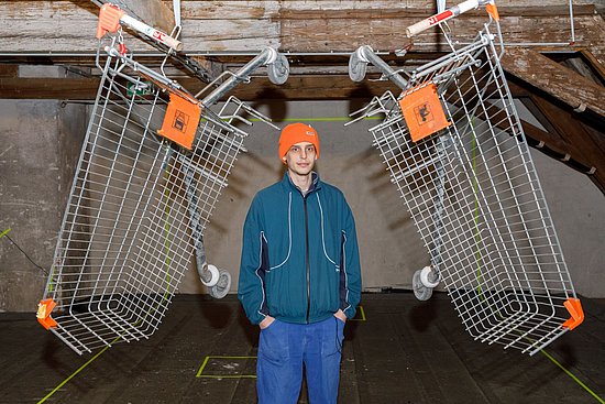 "Wie zwei Schweinehälften im Schlachthof", beschreibt Flo Bogenmayr seine Installation mit Einkaufswagen. © Mark Sengstbratl