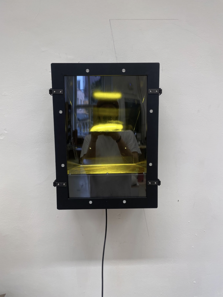 Die Behälter sind so dimensioniert, dass in jeden ein Gegenstand aus der NS-Vergangenheit meines Urgroßvaters passt. Die Boxen bleiben leer, der Inhalt bleibt unbekannt. Gezeigt wird Licht, Farbe, und die Verborgenheit, die sich selbst fetischisiert.