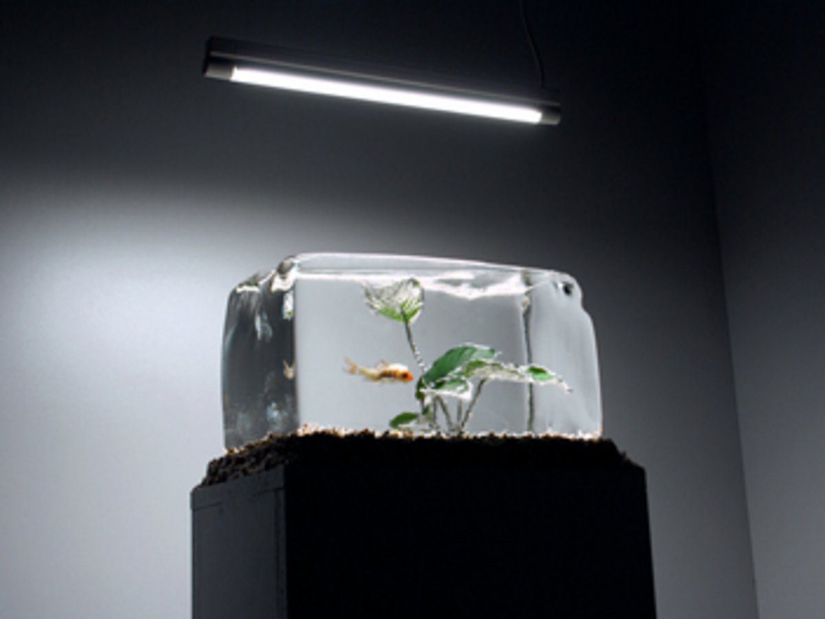 Ein Eisblock, als Inhalt eine stillstehende Situation. Ein Fisch, eine Pflanze und Steine zusammengehalten in einem Block aus gefrorenem Wasser. Ein Objekt, das an die Natur denken lässt, doch dessen Form an ein Aquarium erinnert. Von der Natur oder vom Mensch erzeugte Produkte? Natürliche Situation oder künstliche Komposition? Lebendig oder tot?