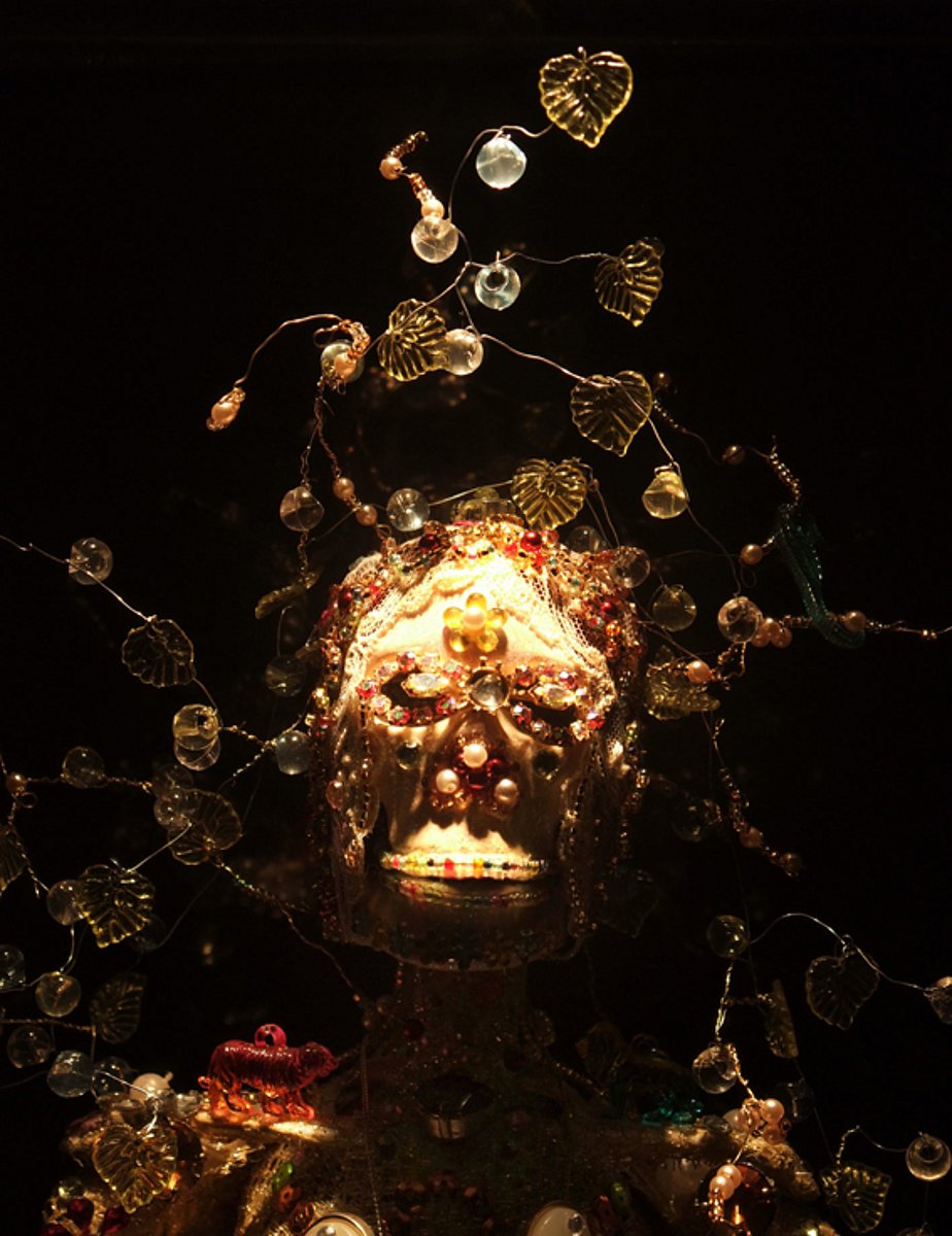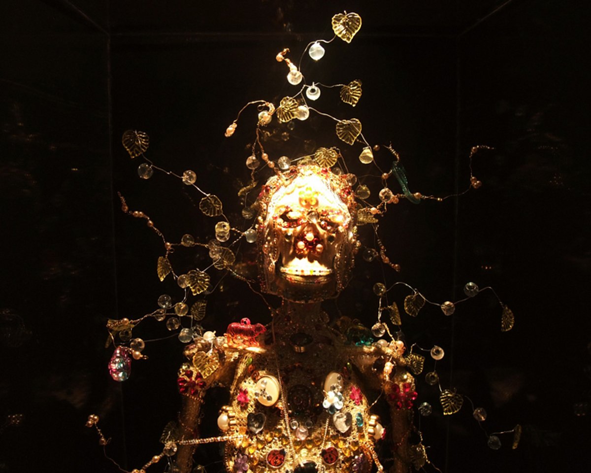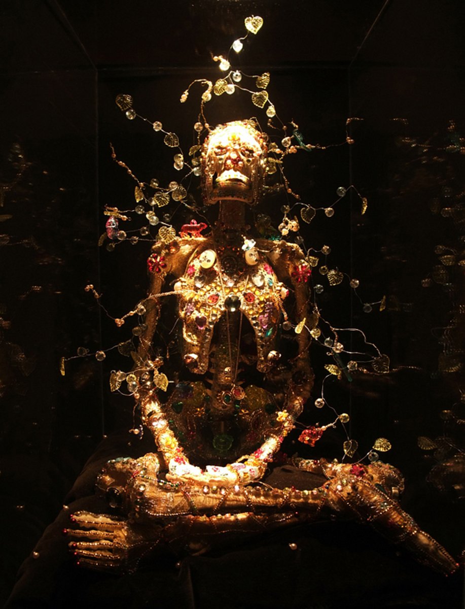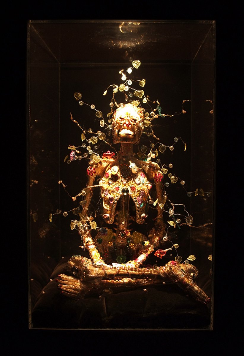 Es gibt ein Gebein, das ist von einem Glanz umhüllt. Einem Glanz aus Golddrähten, glatter Seide, feinen Bändern und Edelsteinen. Es funkelt und glitzert wie Tau. Der glänzende Schmuck umschlingt die trockenen Knochen wie Organe, er überzieht sie dicht wie Fleisch. Ein Mensch kommt zur Welt, stirbt und sein einstiger Leib verschwindet als Hülle. Doch seine Seele währt in den Knochen und es wird ihm ein glänzender und ewiger Körper gegeben. Haruko Maeda rekurriert mit ihrem Werk auf die geschmückten Reliquien der katholischen Kirche als Ausdruck eines lange währenden Substanz- und Essenzglaubens.