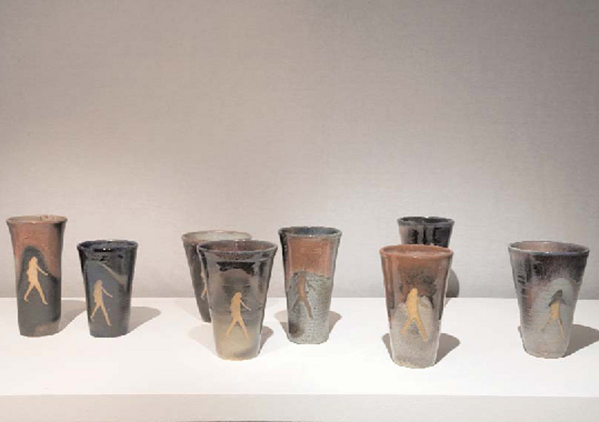 Durch das Beschäftigen mit dem Thema Mensch habe ich den Schritt von Adisa studiert. Ich habe mir von ihrem besonders schwungvollen Schritt eine Schablone gezeichnet und den Schritt von Adisa auf gedrehte Gefäße übertragen. Es entstand eine Serie von 179 aschenglasierten Gefäßen, von denen ich 44 Stück für meine Diplomarbeit ausgewählt habe. Auf diesen Gefäßen zeigt sich der Schritt von Adisa, Form und Glasur am besten.