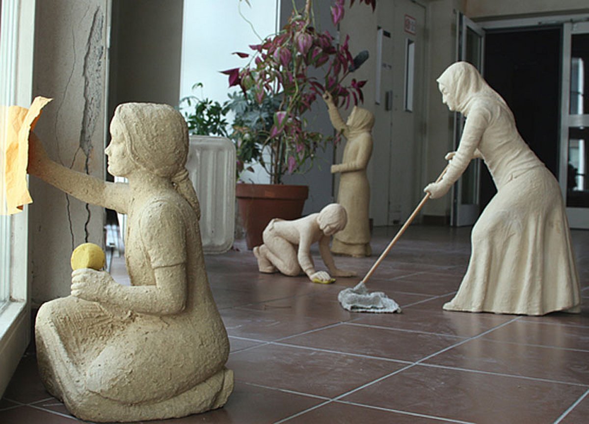 „Den Rest macht hoffentlich die Putzfrau.“ Das sagte eine Kunststudentin, nachdem sie meinen Kaffee ausgeschüttet hatte und die Kaffeepfütze nur notdürftig wegwischte. Durch Erlebnisse mit Mitmenschen ist mir aufgefallen, welch niedrigen Stellenwert Putzfrauen in unserer Gesellschaft haben und mit welcher Ignoranz diesen Frauen begegnet wird. Die Wahrnehmung von Putzfrauen kann man analog setzen mit den Erzählungen von Heinzelmännchen/fräulein. Sie verrichten die Arbeit, die keiner machen will zu einer Uhrzeit, wo sonst niemand anzutreffen ist. Sei es in Wohnungen, Geschäften, Banken oder hier an der Kunstuni. Besonders illegal beschäftigte leben mitten uns, doch so im Verborgenen, dass wir sie meist nicht einmal bemerken.