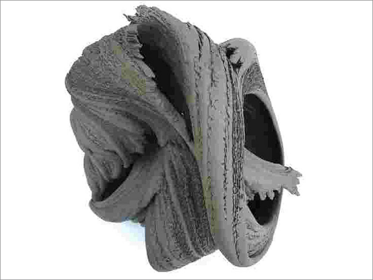Hierfür habe ich die sogenannte Würsteltechnik, eine uralte, äußerst aufwendige, keramische Aufbautechnik verwendet und weiterentwickelt, weil ich damit einerseits sehr präzise, andererseits aber auch sehr intuitiv arbeiten konnte. Dabei wird der feuchte Ton zuerst durch eine Henkelpresse, ähnlich wie beim Nudelteigpressen, in unterschiedlich lange Bänder mit 1mm Stärke und 1cm Breite, gedrückt, dann kreisförmig übereinander aufgebaut und zuletzt durch das Übereinander streichen in Form gebracht.