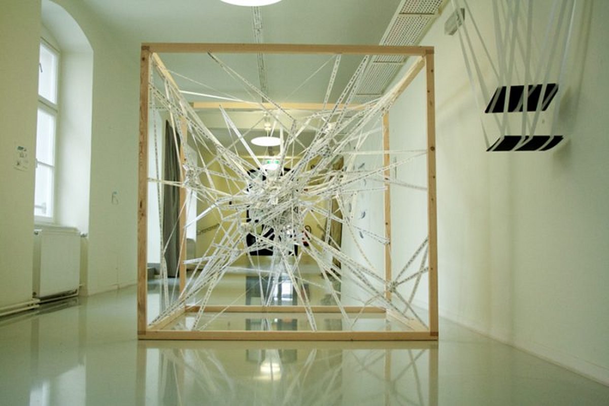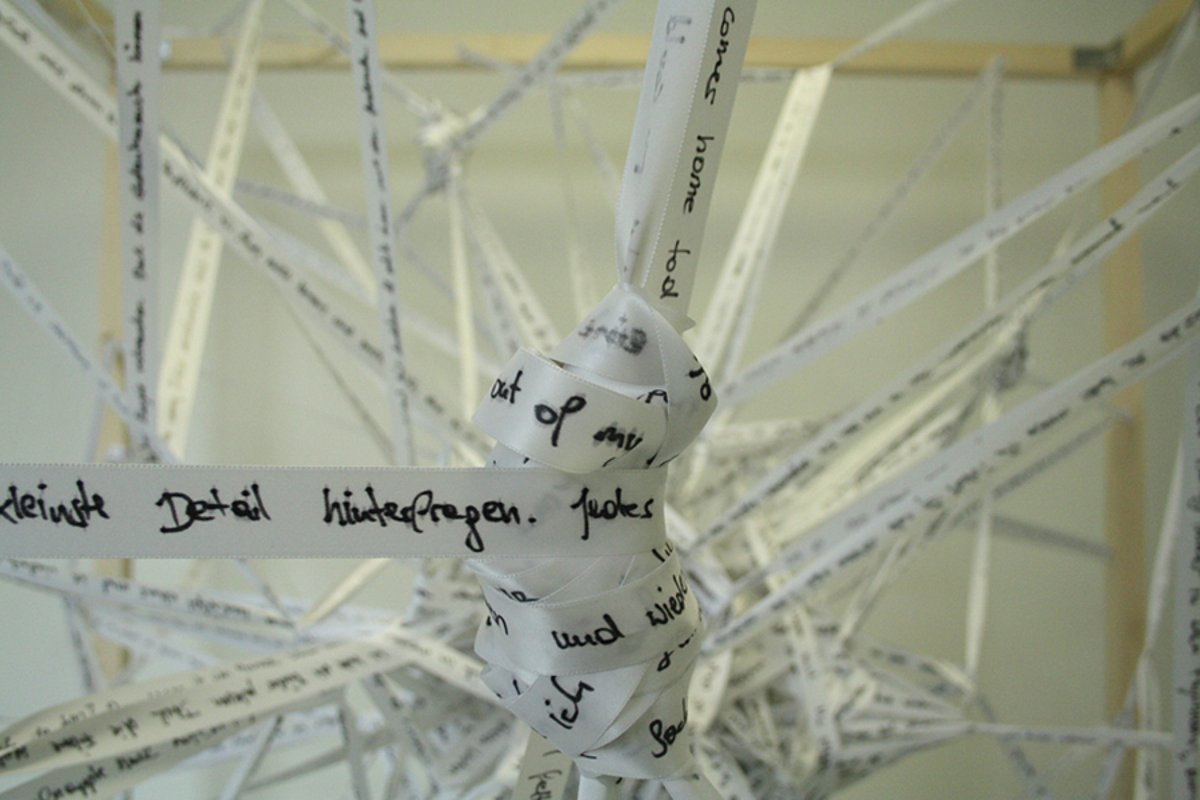 Die Arbeit entstand aus dem Interesse heraus, wie sich Gedankenmuster manifestieren, wie sie funktionieren und was sich über einen längeren Zeitraum auch verändern kann. Manche Gedankenmuster verschwinden, manche verfestigen sich im Handeln und manche werden zum Zwang. Die Arbeit besteht aus einem 180x180x180cm großen würfelartigen Holzrahmen. Dieser ist bespannt mit einem von Hand beschriebenen Band. Dieses Band wird so in den Rahmen gespannt, dass es an eine vereinfachte Form des neuronalen Netzes im Gehirn erinnert. Die Gedankenmuster auf den Bändern werden so auch in der realen Welt miteinander verbunden und treten aus dem virtuellen Gefüge des Gehirns heraus. Die Texte auf den Bändern sind eine Introspektion über die eigenen Gedankenmuster und wie sie sich über die Zeit des Schreibens verändert haben. Diese Texte sind über einen Zeitraum von ungefähr sechs Monaten entstanden. Ein Teil davon ist in diesem Projekt verarbeitet.
