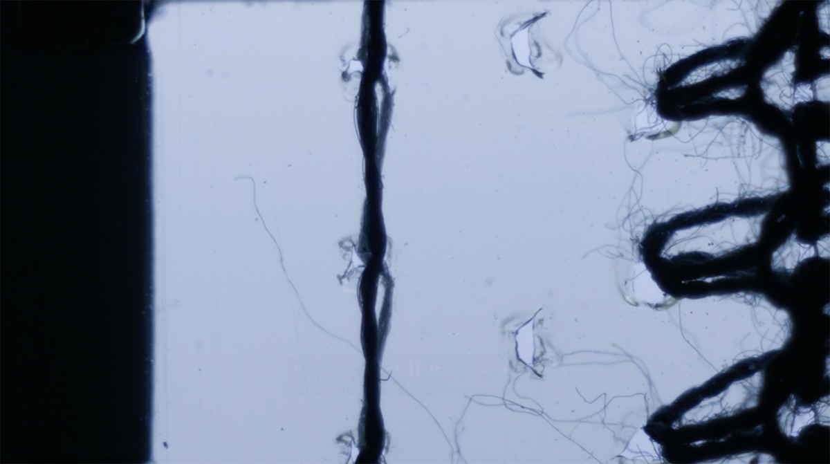 Direct Film ist eine Technik, bei der das Bild nicht mit einer Kamera aufgenommen, sondern direkt auf dem Filmmaterial gezeichnet, eingeritzt oder anderweitig bearbeitet wird. Ausgangspunkt dieser Arbeit war die Auseinandersetzung mit der Rolle der Frau in der Filmgeschichte. In den frühen Jahren des Kinos galt der Filmschnitt oft als „Frauenarbeit“, da er mit dem Nähen verglichen wurde. In dieser Arbeit habe ich auf 16mm-Film mit verschiedenen Fäden, Overlock-Stichen und Stichlängen genäht. Die Nähte greifen nicht nur in das Bild ein, sondern auch in die Tonspur. Dadurch werden die Nähte nicht nur visuell, sondern auch akustisch erfahrbar.