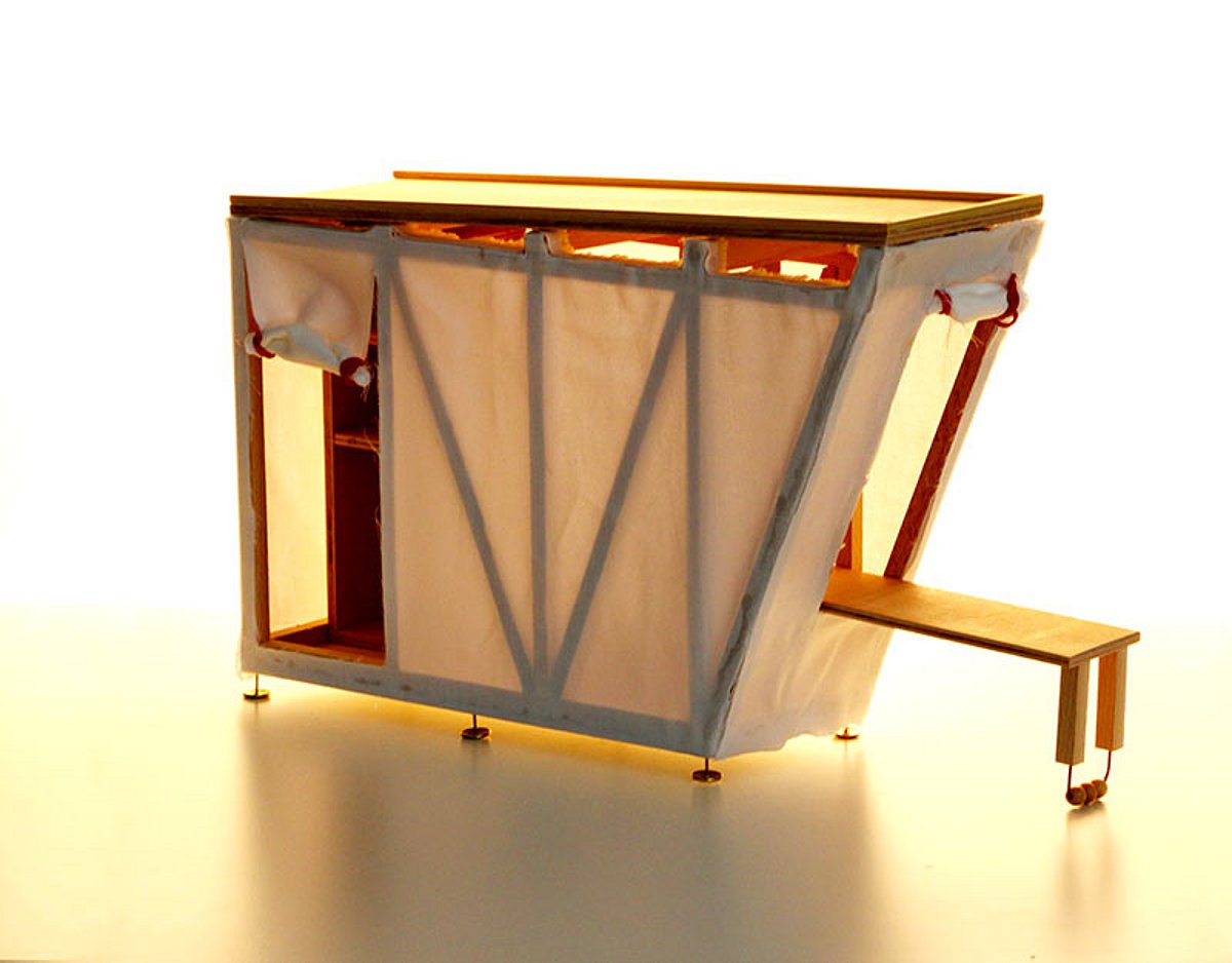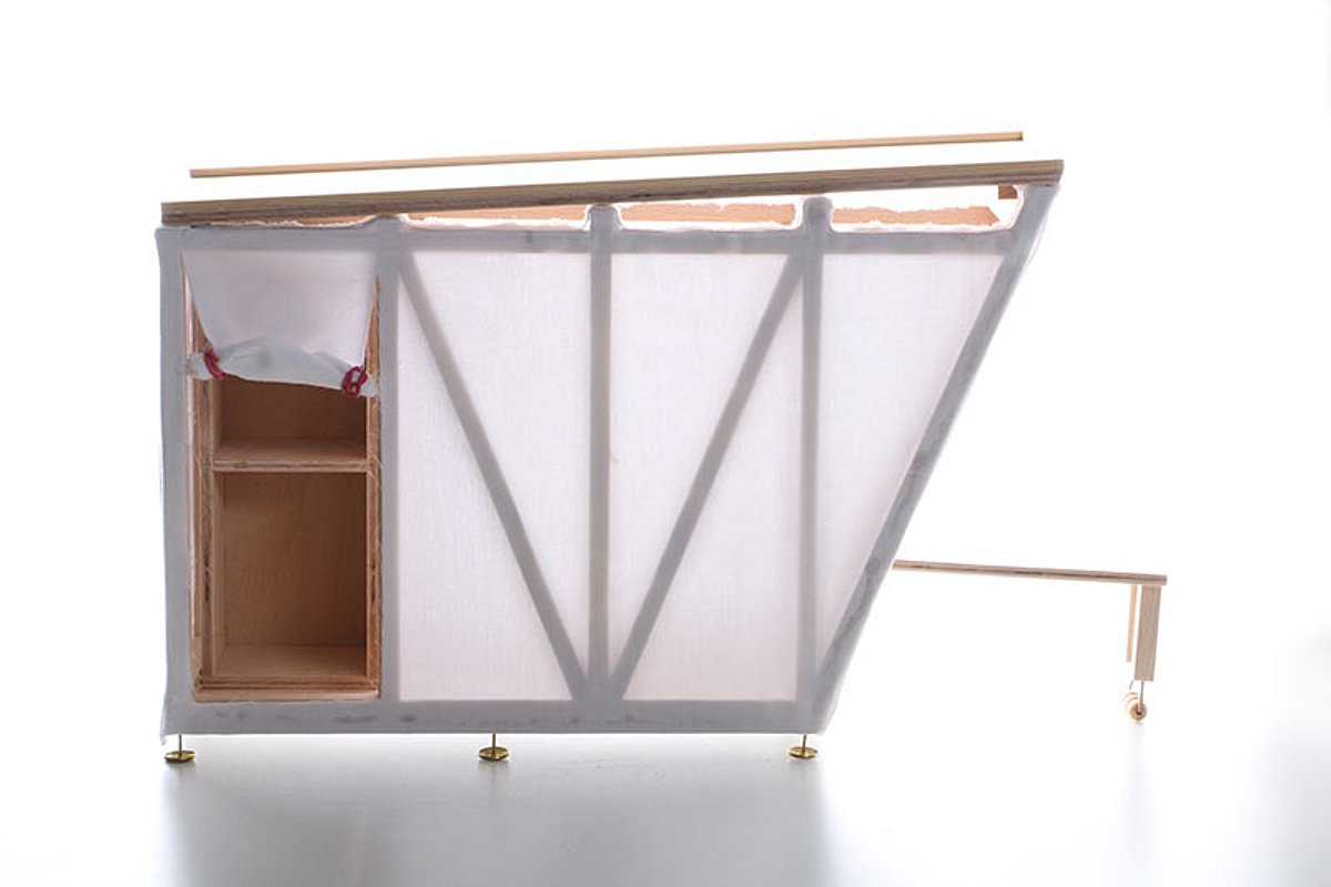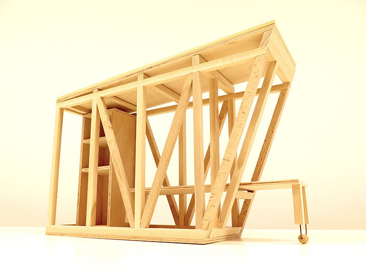 Durch eine Schiebetüre kommt man in das Innere des Gartenhauses. Dort stehen ein Holzschrank und ein über zwei Meter langer Tisch auf vier Rädern. Ein Teil des Tisches ragt immer aus dem Gartenhaus hinaus. Die zwei Beine des hinausragenden Tischteiles können hochgeklappt werden. Die Tischplatte kippt dann trotzdem nicht hinunter, weil sie auf dem Brüstungsriegel auf liegt. Der Tisch kann bei Bedarf bis zum Anschlag fast ganz bis ins Freie gerollt werden, sodass nur mehr die zwei Hinterbeine im Haus stehen. Der Brüstungsriegel dient als Stopper. An der Hausseite, wo die Tischplatte hinausragt, kann die Plane wie ein Zeltfenster hinaufgerollt werden. Die vier unterschiedlich hohen Dachbalken ermöglichen den Abfl uss von Regenwasser. Die seitlich erhöhten Dachkanten wirken wie eine Dachrinne. Eine Dachfolie dient als Witterungsschutz.