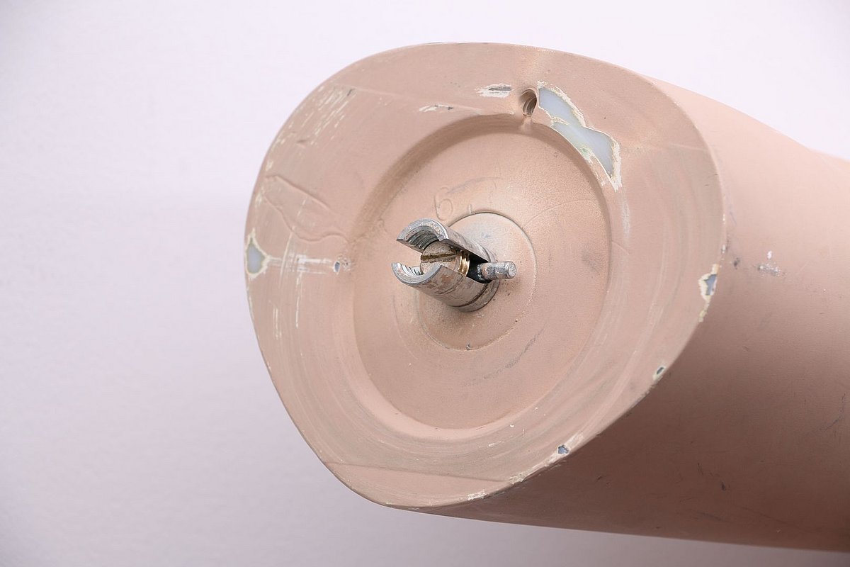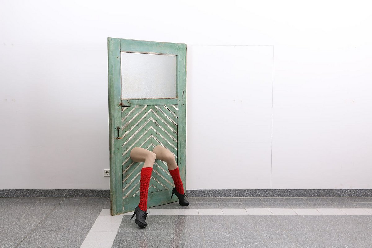 Anziehend ist eine Wandinstallation bestehend aus der ausrangierten Stalltür eines Mühlviertler Bauernhofs und den Beinen einer Schaufensterpuppe. Sie ist nicht nur ein Hingucker, sondern dient als Gelegenheit zum Hinsetzen. Die Tür ist ihrer Grundfunktion zwar enthoben aber dennoch als Wandobjekt beweglich. Die Beine der Schaufensterpuppe sind mit einem Steck-Dreh-System aus Metall am Türblatt befestigt und können jederzeit auf- und abgebaut sowie neu bekleidet werden.