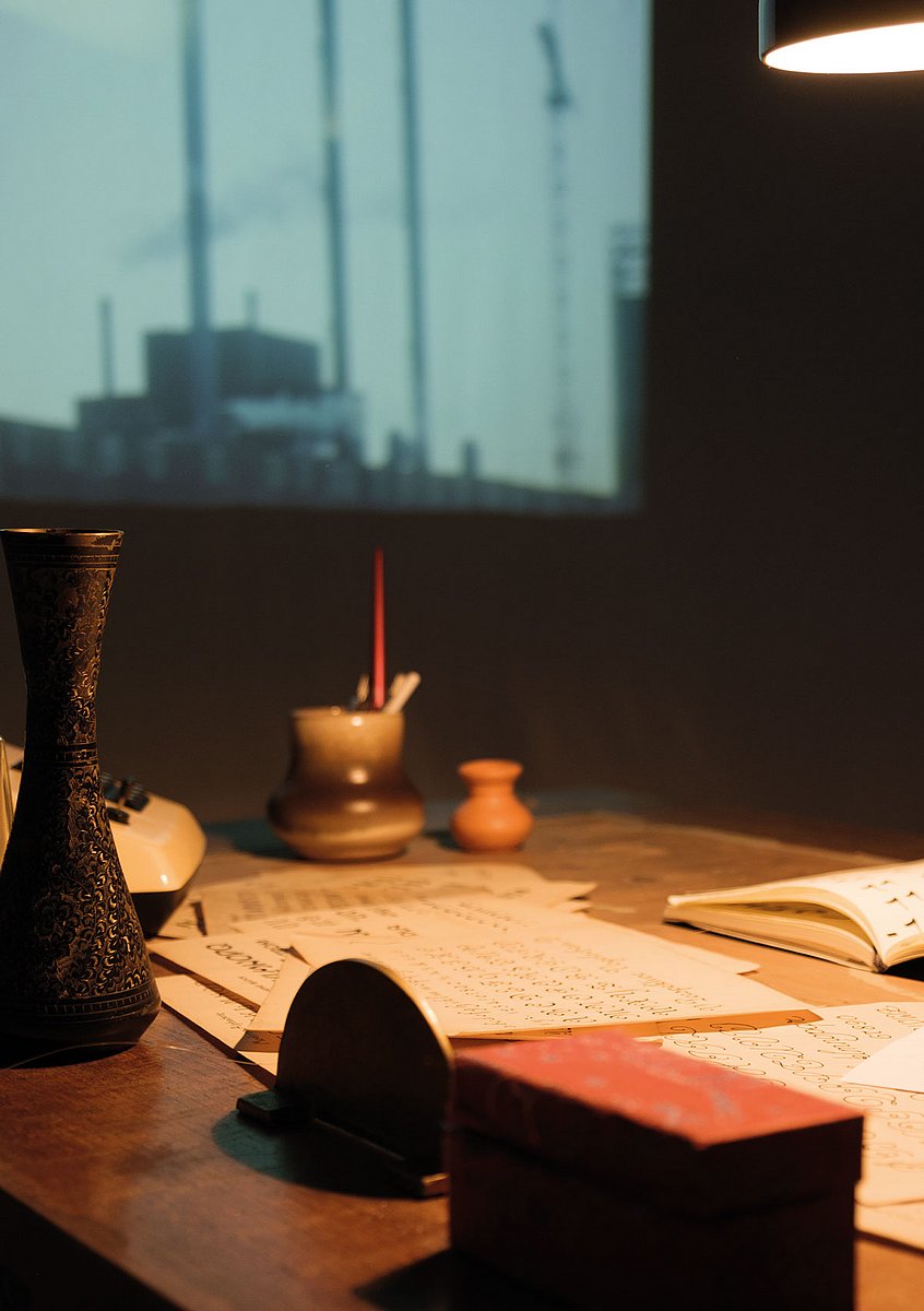 Rauminstallation, bestehend aus einem Schreibtisch, einem PC und Projektionen