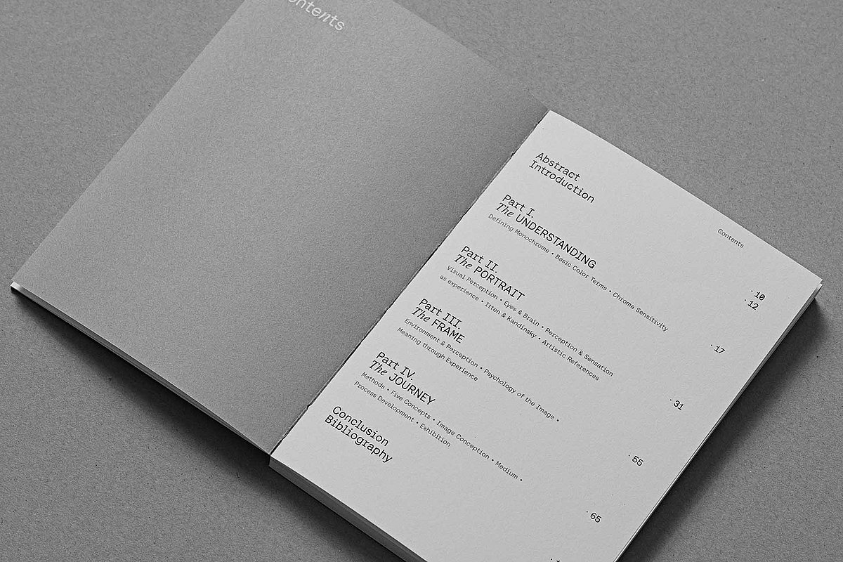 Die Masterarbeit »The Monochrome Passenger« ist eine künstlerische Installation, die eine visuelle Erfahrung von chromatischen Variationen in ihrer grundlegenden Form bietet. Sie ermöglicht es uns, darüber nachzudenken, wie wir die Umgebung visuell wahrnehmen. Das Projekt basiert auf einer künstlerischen Untersuchung der visuellen Wahrnehmung, die die physischen und biologischen Prozesse der Farbwahrnehmung analysiert und sie in eine rein visuelle Sprache übersetzt. Ziel ist es, die Frage zu beantworten, wie Monochrom unsere visuelle Wahrnehmung beeinflusst.
