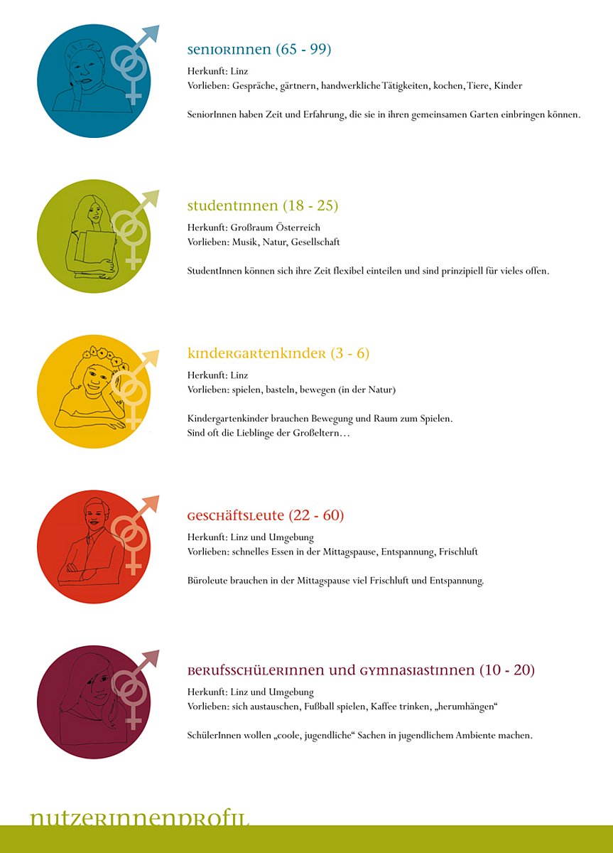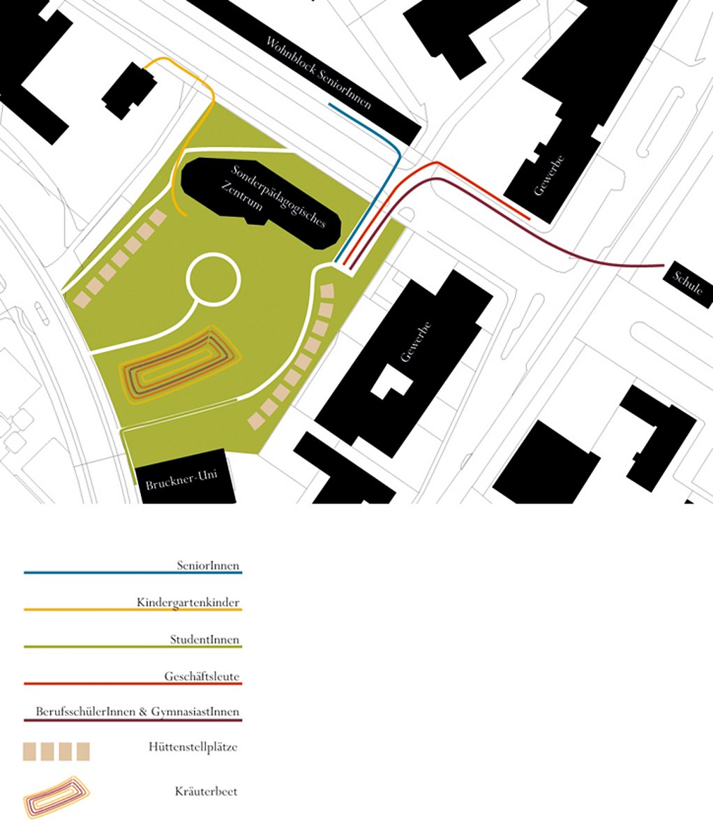 Ziel von „Tete-á-tete“ ist es, den Park zwischen Wildstraße und Peuerbachstraße zu aktivieren. Studentinnen der Anton-Bruckner-Privatuniversität, Seniorinnen, Geschäftsleute, Schülerinnen und Kindergartenkinder aus der Umgebung sollen motiviert werden, diesen Platz gemeinsam zu benutzen und zu beleben. Es werden Mietplätze inkl. Bausatz und Bauanleitung für DIY-Gartenhütten zur Verfügung gestellt. Um einen Austausch zwischen den verschiedenen Nutzerinnengruppen zu garantieren, werden die Nutzerinnengruppen (z.B. Seniorinnen, Studentinnen, ...) in Farben kategorisiert und jeder Mietplatz bekommt einen Farbcode aus 3 Farben zugewiesen. Somit ergibt sich, wer welche Gartenhütte gemeinsam bauen und benutzen darf. Es soll erreicht werden, dass ein erster Kontakt zwischen den Parkbenutzerinnen hergestellt wird und sich ein kleiner öffentlicher Garten für die Nutzerinnen entwickeln kann.