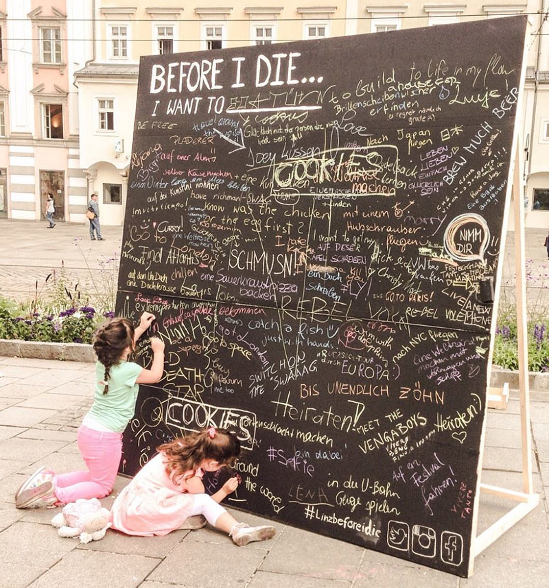 Ein Satz, der die Leute zum stehen bleiben, nachdenken, abschweifen, schmunzeln, schreiben bringt. Wir wollten, dass die Menschen in der heutigen hektischen Welt sich einen Moment Zeit nehmen und über das wesentliche Gedanken machen. Was erwarte ich eigentlich von meinem Leben. Und für das haben wir zu einem ganz einfachem Mittel gegriffen. Ein große Tafel mit der Aufschrift „Before I die, I want to...“ , die wir auf dem Hautplatz gestellt haben, und viel viel bunte Kreide. Und siehe da unsere Tafel wird innerhalb weniger Momente zum Magnet. Eine Menschentraube versammelt sich und beginnt die Tafel mit vielen bunten Antworten zu beschreiben. Fröhliche und auch traurige, eines aber haben sie gemeinsam; sie scheinen immer zumindest einen Hauch von Hoffnung in sich zu tragen.