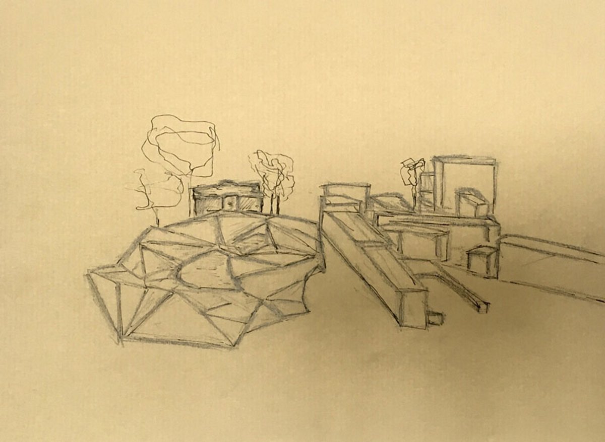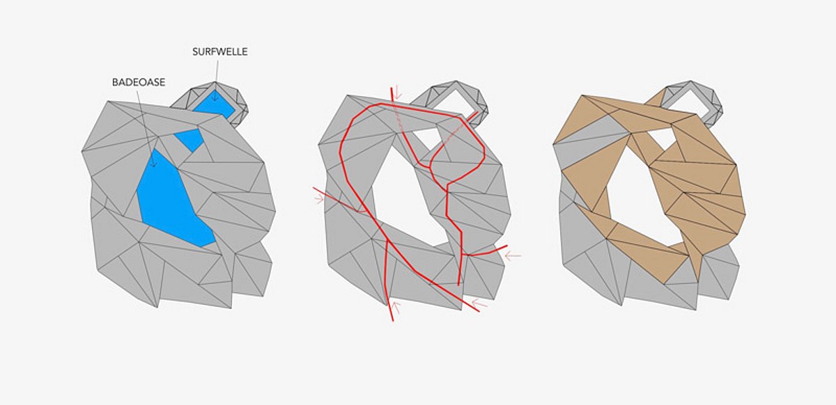 Die Plattform aus Holz wird durch ihre kristallinhafte Form zur Landschaft, impliziert verschiedenste Orte zum Baden, Ruhen, Kommunizieren und bietet sogar eine Welle zum Surfen. Durch die Erhebungen entstehen Steigungen mit Treppen, die sowohl zum Erkunden der Landschaft auffordern als auch zum Verweilen.