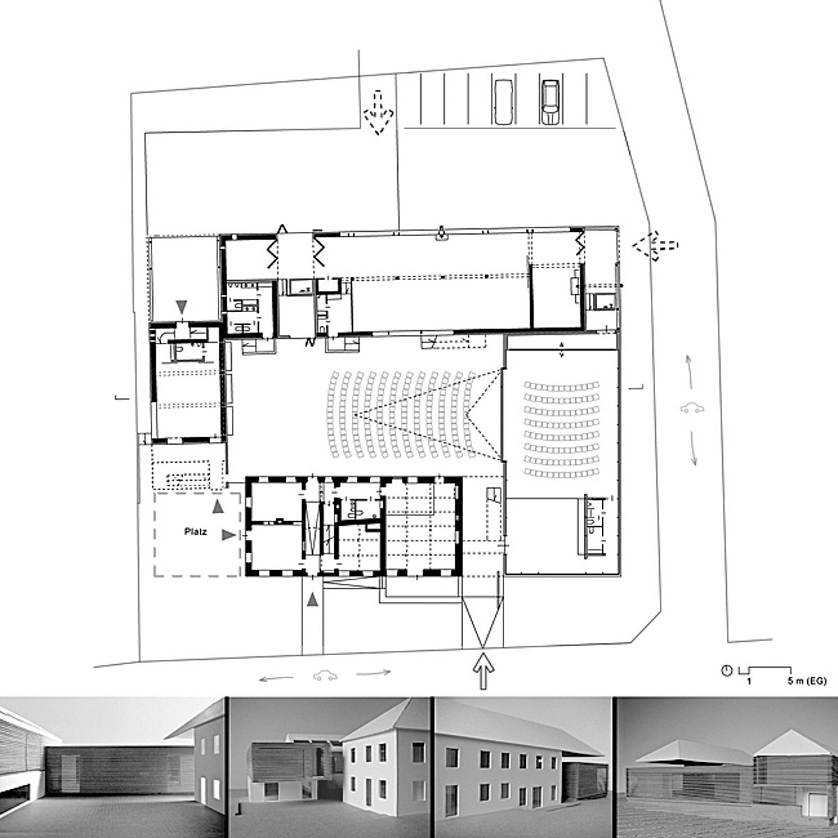 Durch die Erweiterungen nach Norden und Osten schaffen die neuen Bauteile eine klare Struktur der Hofform – einspringender Vierkanter – und setzen sich in ihrer Materialität klar von der Putzstruktur des Bestandes ab. Ihre mehrschichtige Fassade mit einer äußeren, horizontalen Lamellenstruktur aus stehenden und liegenden Holzbrettern und Glaselementen schafft ein Wechselspiel von offen — geschlossen, von öffentlich — privat. Sie umschließt den Innenhof wie ein Band und gewährt punktuell Einblicke in Räume. Zugleich trägt sie die Nutzung öffentlich orientierter Bauteile nach außen.